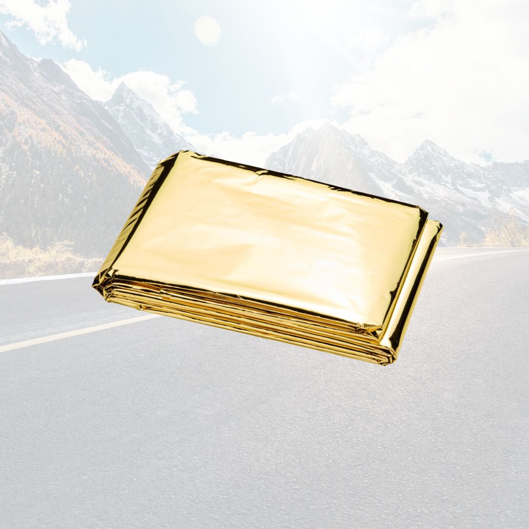 - Nødteppet som kan gi deg beskyttelse mot varme, kulde og fuktighet. Det er perfekt i nødssituasjoner. Når den sølvfargede siden vender mot kroppen vil du være beskyttet mot kulde. Den gyldne siden mot kroppen vil holde deg avkjølt. Teppets størrelse er 160 x 210 cm.